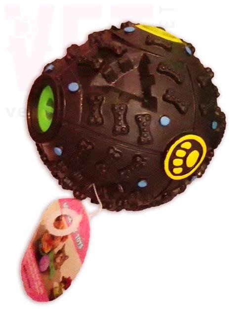 Мяч резиновый среднего размера для собак, щенков, внутри с отверстием для сухого корма. Способствует массажу десен, очистке зубов. Игрушка при движении издает звук, подходит для игр и обучения животного, приносит огромное удовольствие домашнему питомцу.