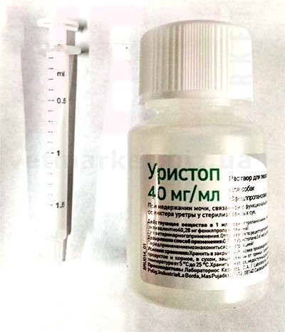 Уристоп — лекарственный препарат в форме раствора для перорального применения содержит в 1 мл в качестве действующих веществ 50 мг фенилпропаноламина гидрохлорида (эквивалентно 40,28 мг фенилпропаноламина) и растворитель (некристаллизуемый жидкий сорбитол) — до 1,0 см³. По внешнему виду представляет собой прозрачную жидкость, от бесцветного до светло-желтого цвета. Препарат выпускают расфасованным по 30; 50 и 100 мл во флаконах из полиэтилена, герметично закрытые завинчивающимися пластиковыми крышками. Флаконы упаковывают в индивидуальные картонные коробки в комплекте со шприцем-дозатором. Условия отпуска препарата: по рецепту ветеринарного врача.